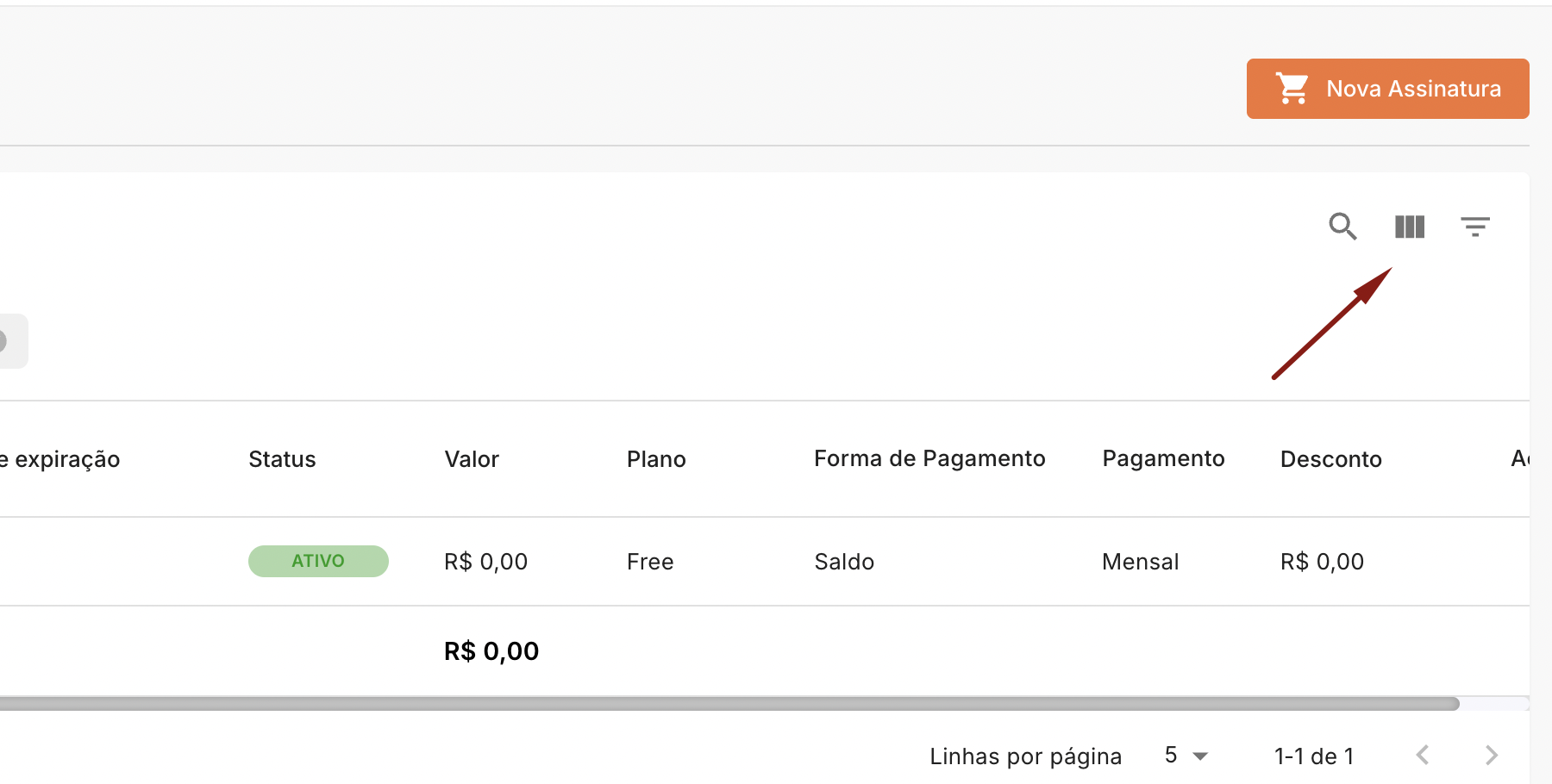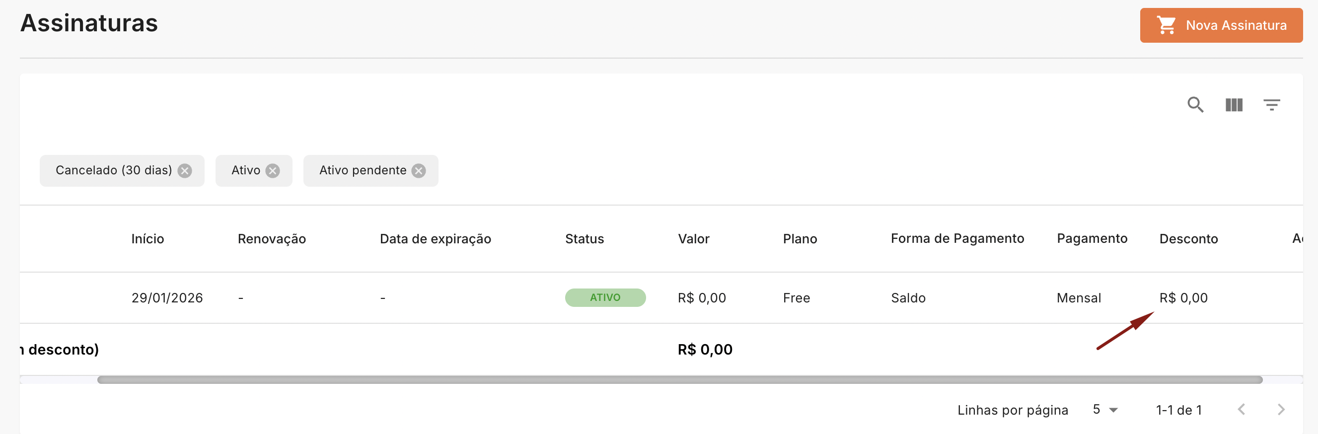 Após a finalização da compra, o desconto aplicado em sua assinatura estará exibido na coluna "Desconto".