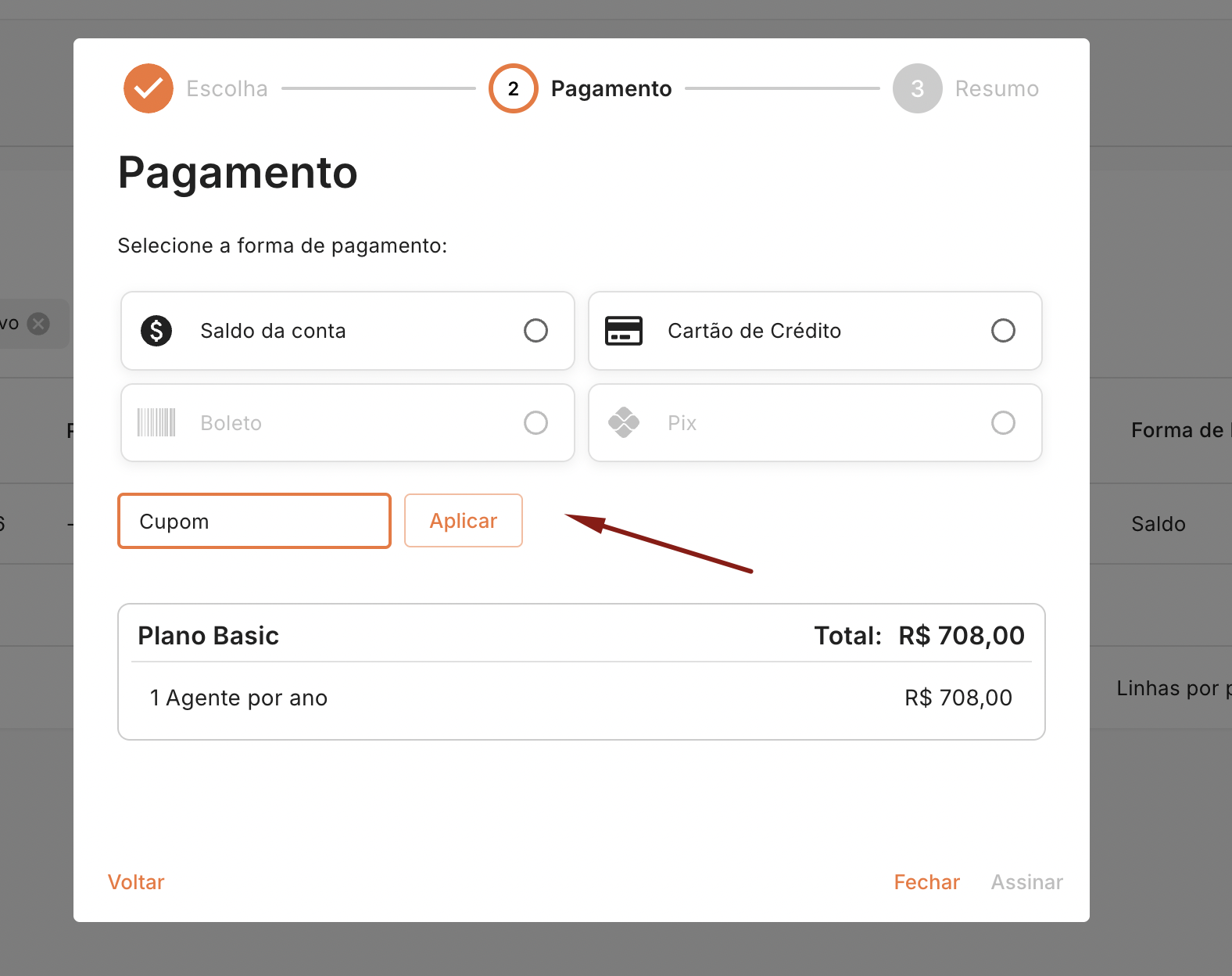 Após inseri-lo, o sistema apresentará uma mensagem informando se o cupom é válido ou não. Caso seja, o desconto será aplicado automaticamente e você poderá prosseguir com sua assinatura.
