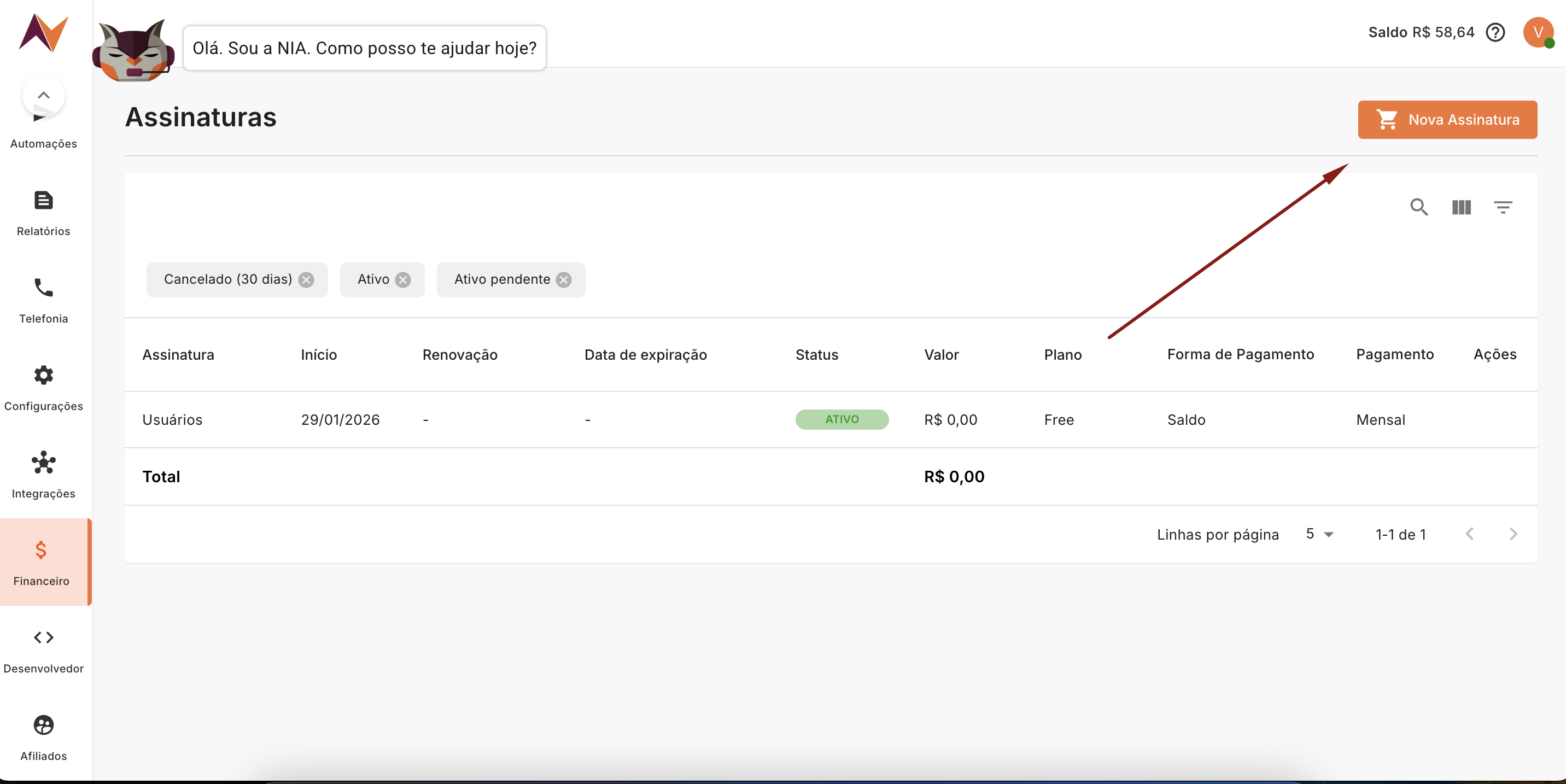 Depois de acessar sua conta no seu painel Nvoip, você deverá acessar o menu "Financeiro" -> "Assinaturas" -> "Nova Assinatura".