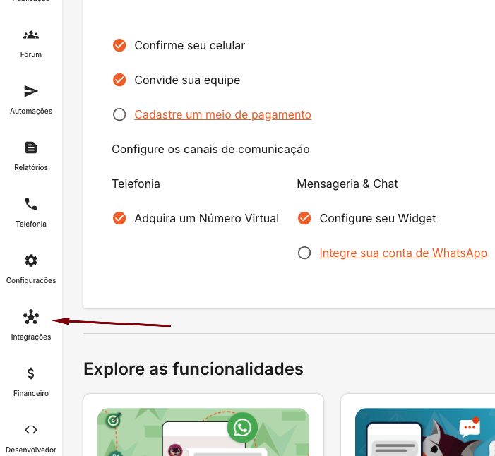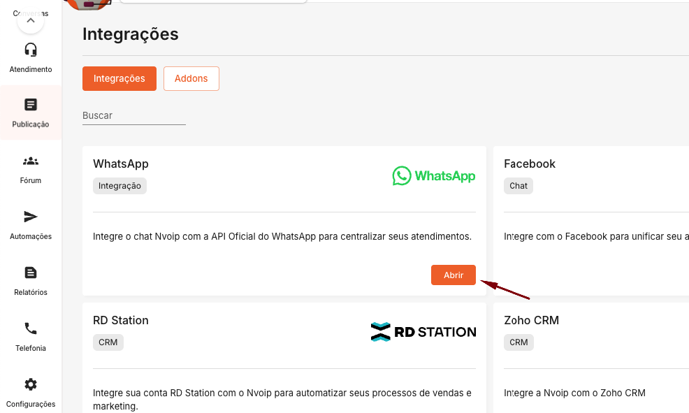 [Integrações] e logo após clique em "Abrir" na integração com o WhatsApp.