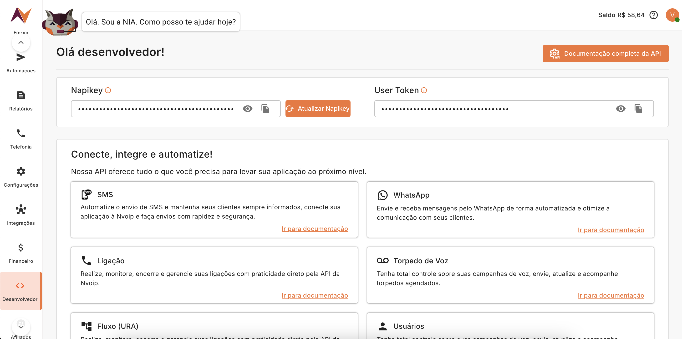 No menu [Desenvolvedor] encontra-se a Napikey e o User Token do usuário.